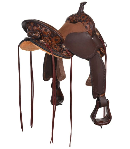 Riders will love the feel of the Circle Y Sunflower Trail Saddle with its pre-turned fenders, impact foam seat, and EBS stirrups. The Flex2 Trail 5 tree in this saddle has all the great features of a classic Flex2 trail tree but with a 1 1/2 inch taller swell and 1 inch taller cantle for a more secure, supportive seat. The seat has Apache leather, a textured leather that is not as grippy as suede but has more stick than grainout plus a handsome distressed rich brown color. Six long saddle strings let you tie on your gear with ease. Finally, there’s that gorgeous sunflower hand-tooling with a classic border and stunning sunflower conchos to match.