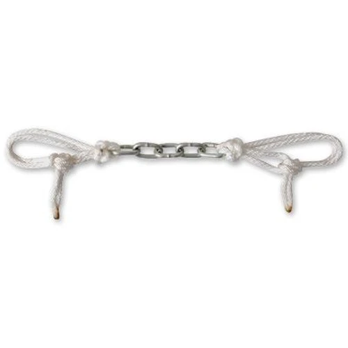 Dog Chain Curb Strap from Martin Saddlery has a 5-link stainless steel chain in the center. The ends are white string/rope ties that are adjustable. The ends attach with a simple knot. The chain is connected to the ties with a knot that adds a bit of targeted pressure. One size.