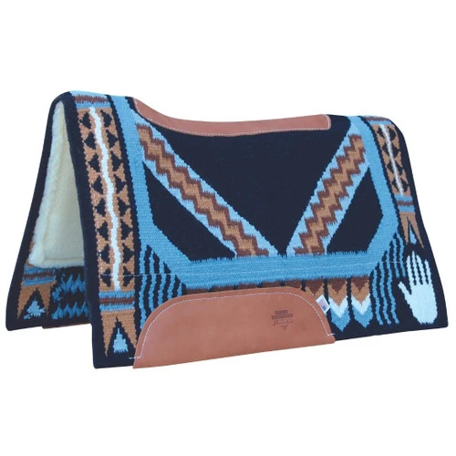 Comfort-Fit SMx Air Ride Saddle Pad locks into place on the horse’s back so the pad moves with the horse. The Air Ride core has a shock absorbing material found in protective athletic gear, giving your horse the ultimate in impact protection. It is lightweight and cooling to reduce muscle fatigue and improves saddle fit. The merino wool fleece bottom is sweat wicking and breathable. The custom designed New Zealand wool hand-woven blanket top is truly special. The Hand to Horse pad from Professional’s Choice was designed to honor the trust and communication between horse and rider. The hand print, lightning, and feather images are meaningful symbols for horses from Native American lore.